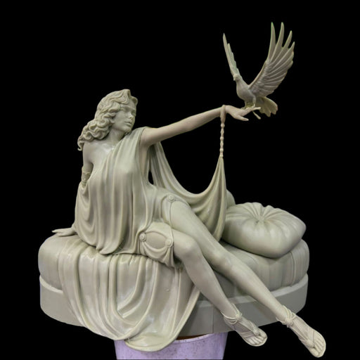 Dungeon Master MinisRetro-inspired 1950s pin-up girl figurine lounging on a plush round seat with a dove perched on her raised hand. Draped in a flowing satin-like dre...