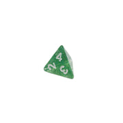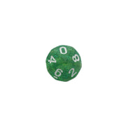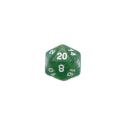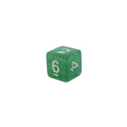 Transparent green dice with green glitter and white numbers.