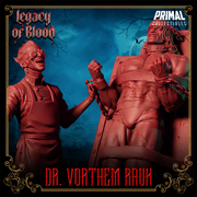 Doctor Vorthem Rauk, a Frankenstein-inspired mad scientist from the Legacy of Blood series, works on his monstrous creation strapped to a tilting laboratory slab. Highly detailed gothic horror miniature perfect for D&D, Pathfinder, and horror-themed TTRPG encounters.
