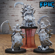 Mind Mistress miniatures feature female mind flayers wielding scythes and adorned in ornate robes, including a throne variant seated on skulls. Perfect aberration enemies for Dungeons & Dragons, Pathfinder, and other TTRPG campaigns, adding menace and style to your tabletop encounters.