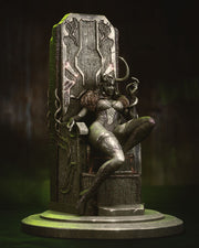 Lady Loki, seated upon an ornate throne, exudes regal authority and trickster charm. Draped in a flowing green and gold ensemble with a fur-lined cape, she rests confidently, her horned crown accentuating her divine mischief. A must-have Marvel Comics collectible for fans of Asgardian lore and powerful female figures.