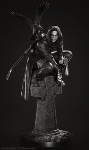 The Crow collectible figure, capturing the iconic anti-hero with a crow perched on his shoulder and his guitar strapped on his back. This dark and brooding piece is ideal for fans of the graphic novel and film series. A standout addition to any gothic-themed collection.