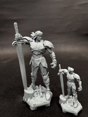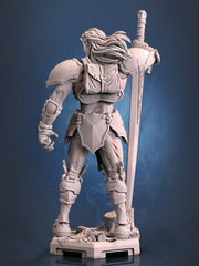 A powerful swordsman miniature clad in ornate armor, gripping an immense greatsword with a commanding stance. His flowing hair and intricate plating add to his heroic presence, making him ideal for fantasy TTRPGs like Dungeons & Dragons and Pathfinder. A perfect addition for collectors, game masters, and painters seeking a dynamic warrior figure.