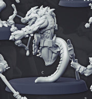 Jik the Ranger, a lizardman archer miniature, comes armed with bows, spears, and mix-and-match weapons. Perfect for fantasy TTRPGs like Dungeons & Dragons, Pathfinder, or Warhammer, this figurine embodies the cunning precision of reptilian hunters on the battlefield.